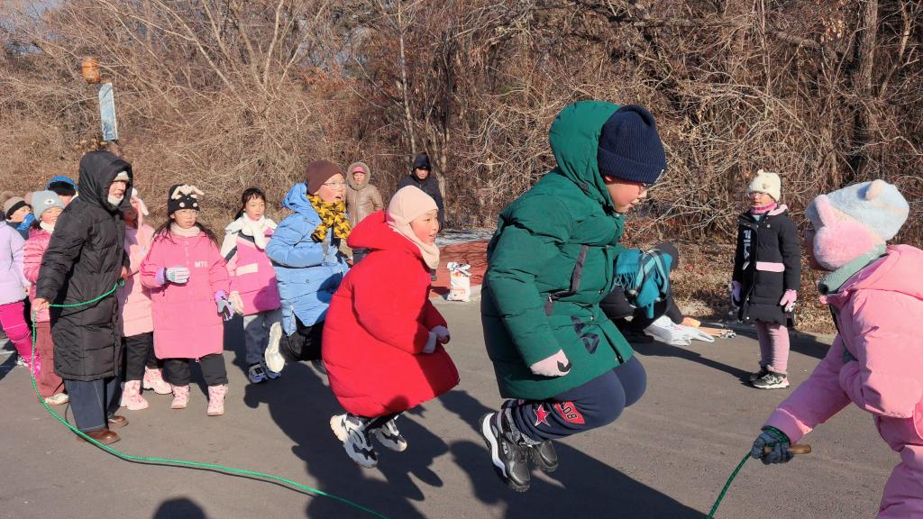 12月3日,吉林省第二实验学校的学生在南湖公园开展“亲近自然银冬初体验”主题活动,图为学生们在跳大绳。新华社记者 李典 摄